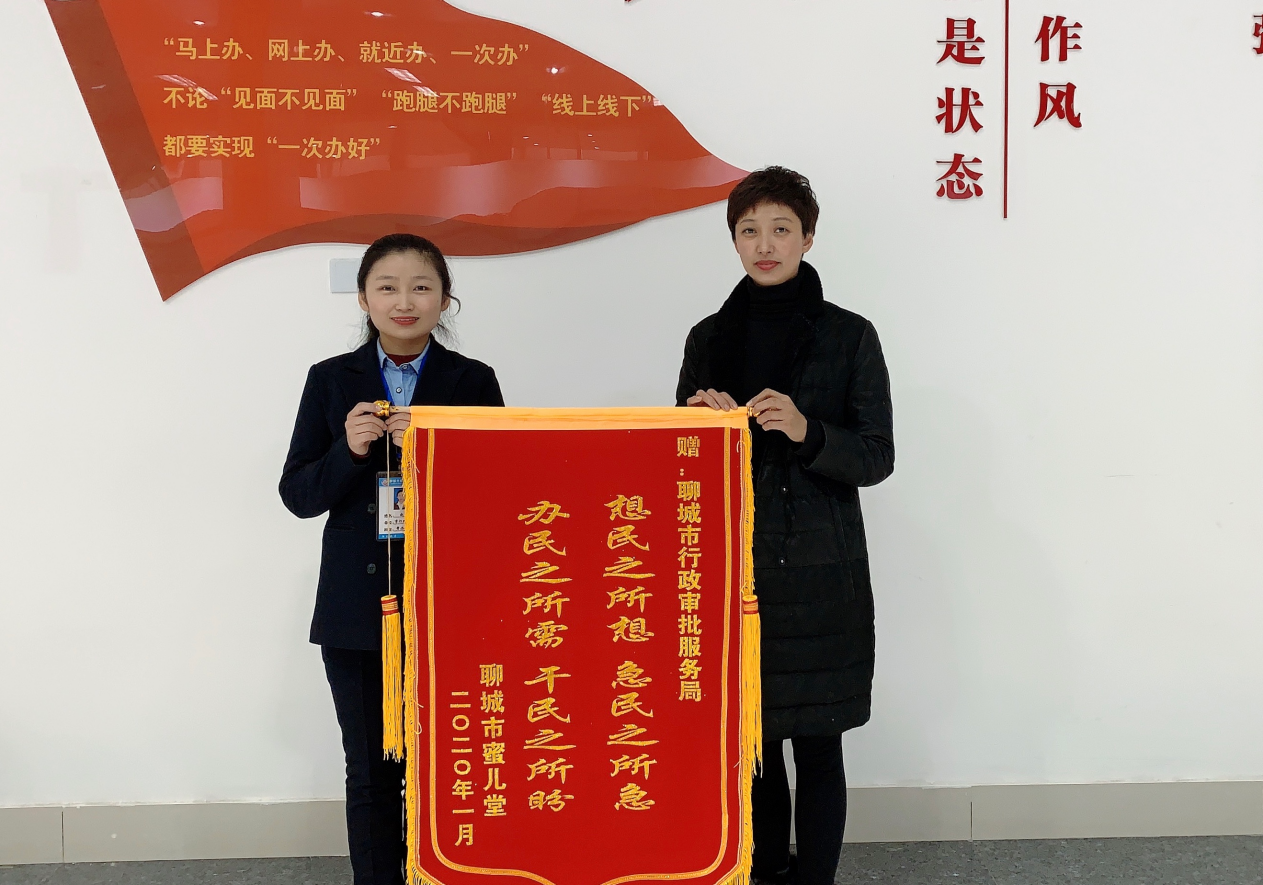 2020年1月6日上午,“聊城市蜜儿堂健康管理咨询有限公司”负责人孙维娜为市行政审批服务局帮办代办工作人员送来一面绣有“想民之所想 急民之所急 办民之所需 干民之所盼”的锦旗,对帮办代办科工作人员尽职尽责、热情周到的服务表示了高度赞扬和诚挚感谢。